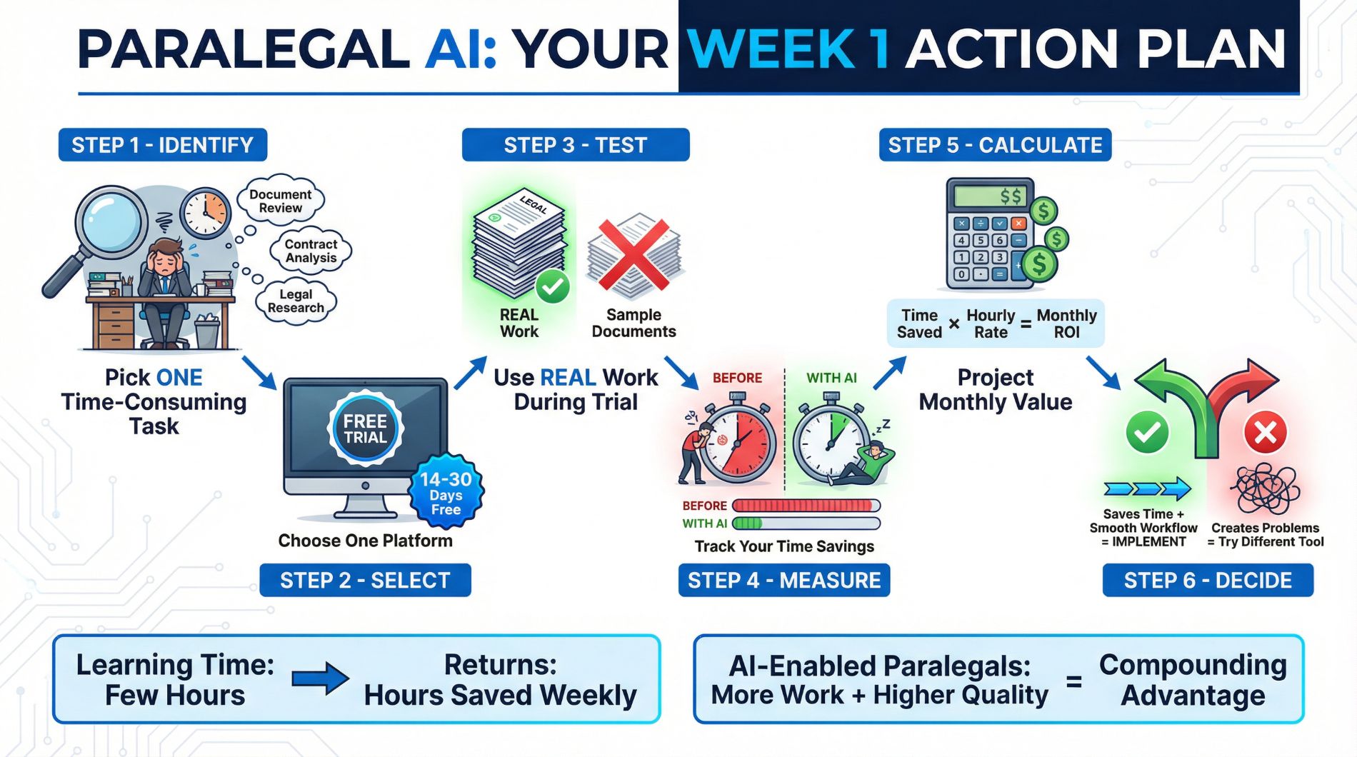 Pick one specific task that consumes excessive time and produces frustration. Document review, contract analysis, or legal research represent good starting points.
