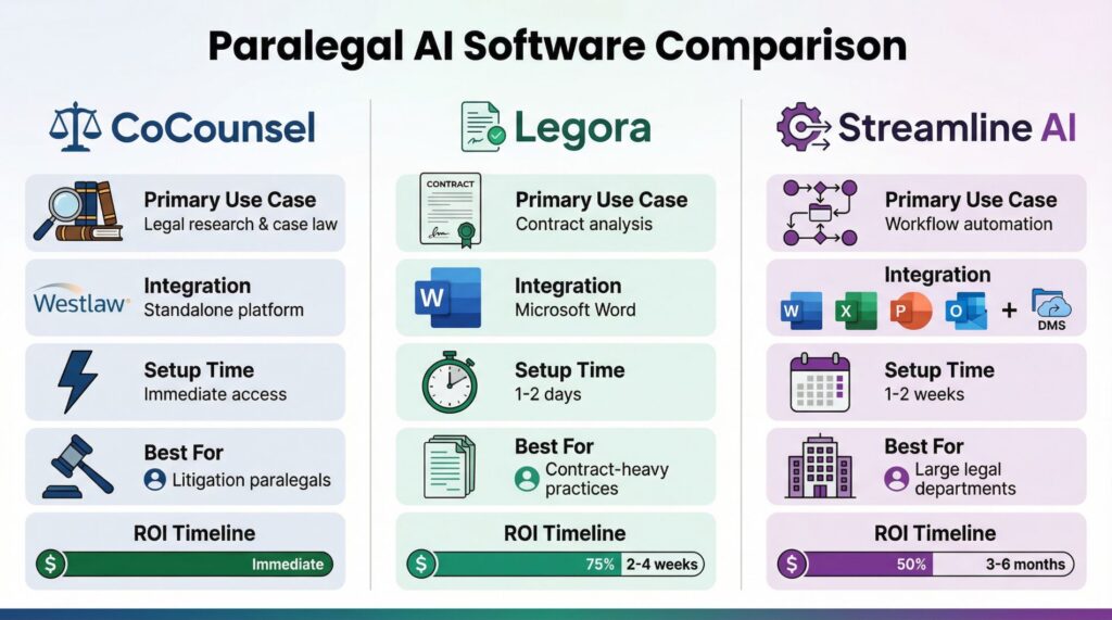 | Best For | Litigation paralegals | Contract-heavy practices | Large legal departments |